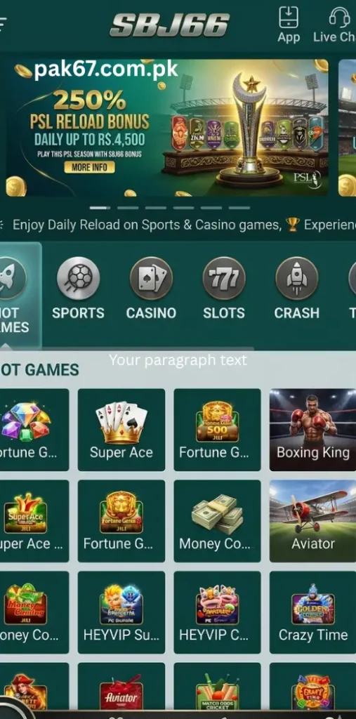 SBJ66 Game is a popular online gaming platform in Pakistan that offers slots, card games, live casino games, and real money rewards.